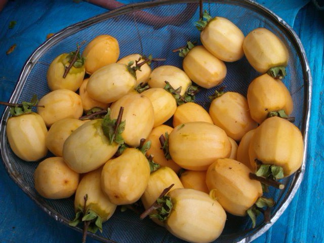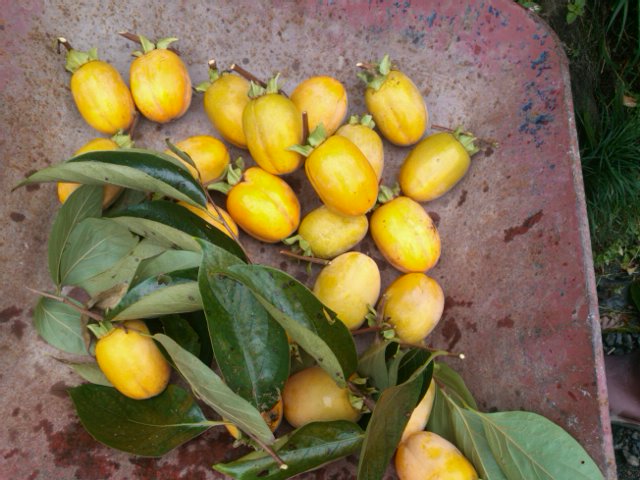| 三田村農園の自宅近くのヤブ(杉林)には、シイタケ栽培、山椒、栗、渋柿などの木があります。 甘柿の木も自宅近くの別のところにあるのですが、この日は家族総出で渋柿をとりました。 高枝鋏で、柿の根元の枝を挟んで、すぐ上の枝を切ります。 こうすれば、柿は落ちず、1つずつ丁寧に収穫出来ます。 写真は、息子が高枝鋏で柿をとっている様子。 ![]() 柿を落とすとキズが付きますので、落とさないようにゲットします! ![]() 下の写真は、とった渋柿の一部です。 一輪車に入れて、自宅まで運びます。 大きい柿でしょ! この柿の品種、なんだったかな〜 細長い、吊るし柿用です。 中には熟した柿もあり、これは その場で食べました。 甘柿が熟したのは美味しくないですが、渋柿の熟したのはメチャ甘くて美味しいです。 ![]() 渋柿の木は2本あるのですが、今年は(我が家としては)豊作で、全部で130個程度とれました。 とった渋柿は、台所で使う皮むきで1つづつ皮を剥きます。 包丁で皮を剥くと、皮が厚くなりますので、皮むきを使うのが一番。 大量に吊るし柿を作っているところは、機械で皮を剥くのですが、我が家では全て手作業! 数があると、これがチト面倒。 下の写真は、皮を剥いた柿です。 ヘタの部分は、吊るすための枝の部分を少し残しておきます。 ![]() この皮を剥いた渋柿をヒモに吊るしていきます。 昔は藁縄に吊るしたのですが、我が家ではビニールヒモを利用。 ![]() 雨があたらない軒先に吊るし、しばらくすると表面の皮が張ってきます。 囲炉裏の煙でいぶすところもあるようですが、我が家は、完全 天日干し! 柿が黒ずんで、柔らかくなってきたら食べられます。 あの渋柿が吊るすことによって、甘い吊るし柿になる。 昔の人の知恵に感心! 完全無農薬・無肥料栽培の渋柿・・・ハッキリ言って、ほったらかしの木です。 でも、こうして実をつけてくれるのは嬉しいですね。 もう少しすれば、吊るし柿の自然の甘みが味わえます。 平成23年10月30日 三田村農園 三田村淳一 |