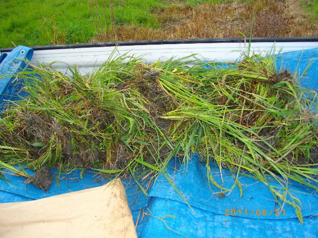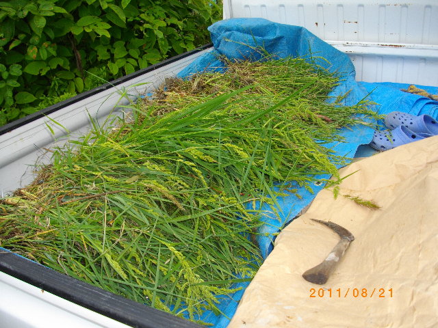| ↑ 軽トラに積まれた田んぼのヒエ。 [2011年8月21日撮影] |