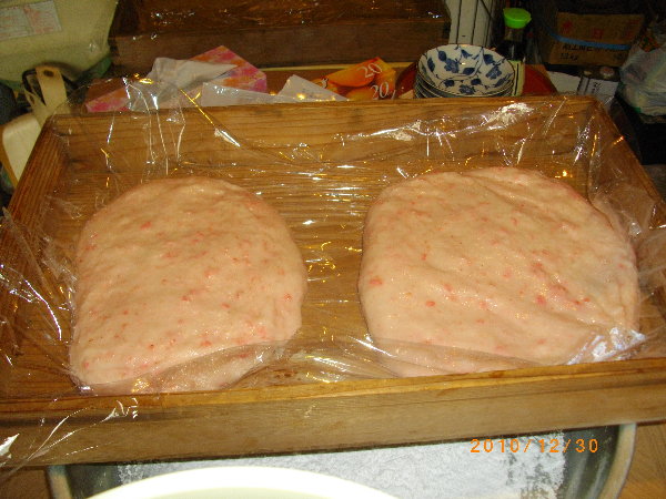 | 後はお正月用のお鏡さん(鏡餅)、丸餅などを作り、今回はエビ餅も作りました。 このエビ餅は固くならない内に切って、それを焼いて食べます。 エビの香りがして、砂糖も入っているので美味しいですよ! |