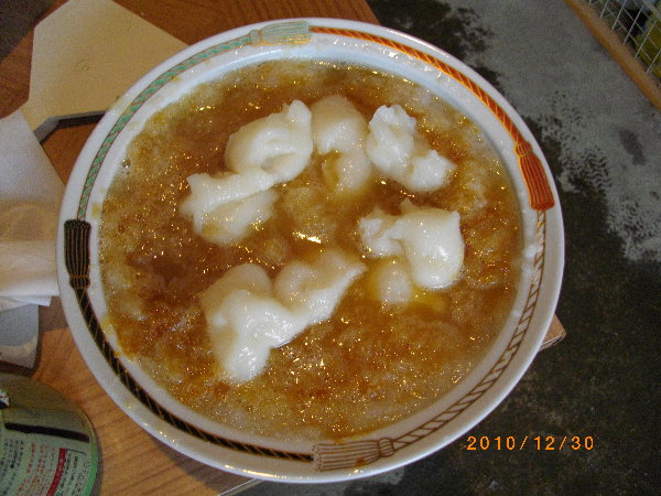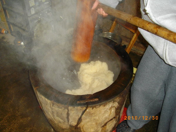 | 臼の中から、つきたてのお餅をちぎり取り、ダイコンおろしに入れて食べます。 これが福井では定番の「おろし餅」 私はこの「おろし餅」が大好き。 餅つきの時にしか食べれない「おろし餅」これを食べるのが楽しみで餅つきをやるようなものです。 |