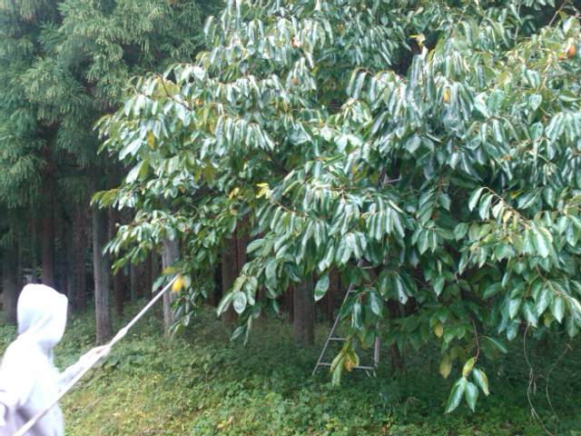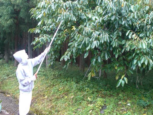 | 三田村農園の自宅近くのヤブ(杉林)には、シイタケ栽培、山椒、栗、渋柿などの木があります。 甘柿の木も自宅近くの別のところにあるのですが、この日は家族総出で渋柿をとりました。 高枝鋏で、柿の根元の枝を挟んで、すぐ上の枝を切ります。 こうすれば、柿は落ちず、1つずつ丁寧に収穫出来ます。 写真は、息子が高枝鋏で柿をとっている様子。 ![]() 柿を落とすとキズが付きますので、落とさないようにゲットします! ![]() 下の写真は、とった渋柿の一部です。 一輪車に入れて、自宅まで運びます。 大きい柿でしょ! この柿の品種、なんだったかな〜 細長い、吊るし柿用です。 中には熟した柿もあり、これは その場で食べました。 甘柿が熟したのは美味しくないですが、渋柿の熟したのはメチャ甘くて美味しいです。 ![]() 渋柿の木は2本あるのですが、今年は(我が家としては)豊作で、全部で130個程度とれました。 とった渋柿は、台所で使う皮むきで1つづつ皮を剥きます。 包丁で皮を剥くと、皮が厚くなりますので、皮むきを使うのが一番。 大量に吊るし柿を作っているところは、機械で皮を剥くのですが、我が家では全て手作業! 数があると、これがチト面倒。 下の写真は、皮を剥いた柿です。 ヘタの部分は、吊るすための枝の部分を少し残しておきます。 ![]() この皮を剥いた渋柿をヒモに吊るしていきます。 昔は藁縄に吊るしたのですが、我が家ではビニールヒモを利用。 ![]() 雨があたらない軒先に吊るし、しばらくすると表面の皮が張ってきます。 囲炉裏の煙でいぶすところもあるようですが、我が家は、完全 天日干し! 柿が黒ずんで、柔らかくなってきたら食べられます。 あの渋柿が吊るすことによって、甘い吊るし柿になる。 昔の人の知恵に感心! 完全無農薬・無肥料栽培の渋柿・・・ハッキリ言って、ほったらかしの木です。 でも、こうして実をつけてくれるのは嬉しいですね。 もう少しすれば、吊るし柿の自然の甘みが味わえます。 平成23年10月30日 三田村農園 三田村淳一 |